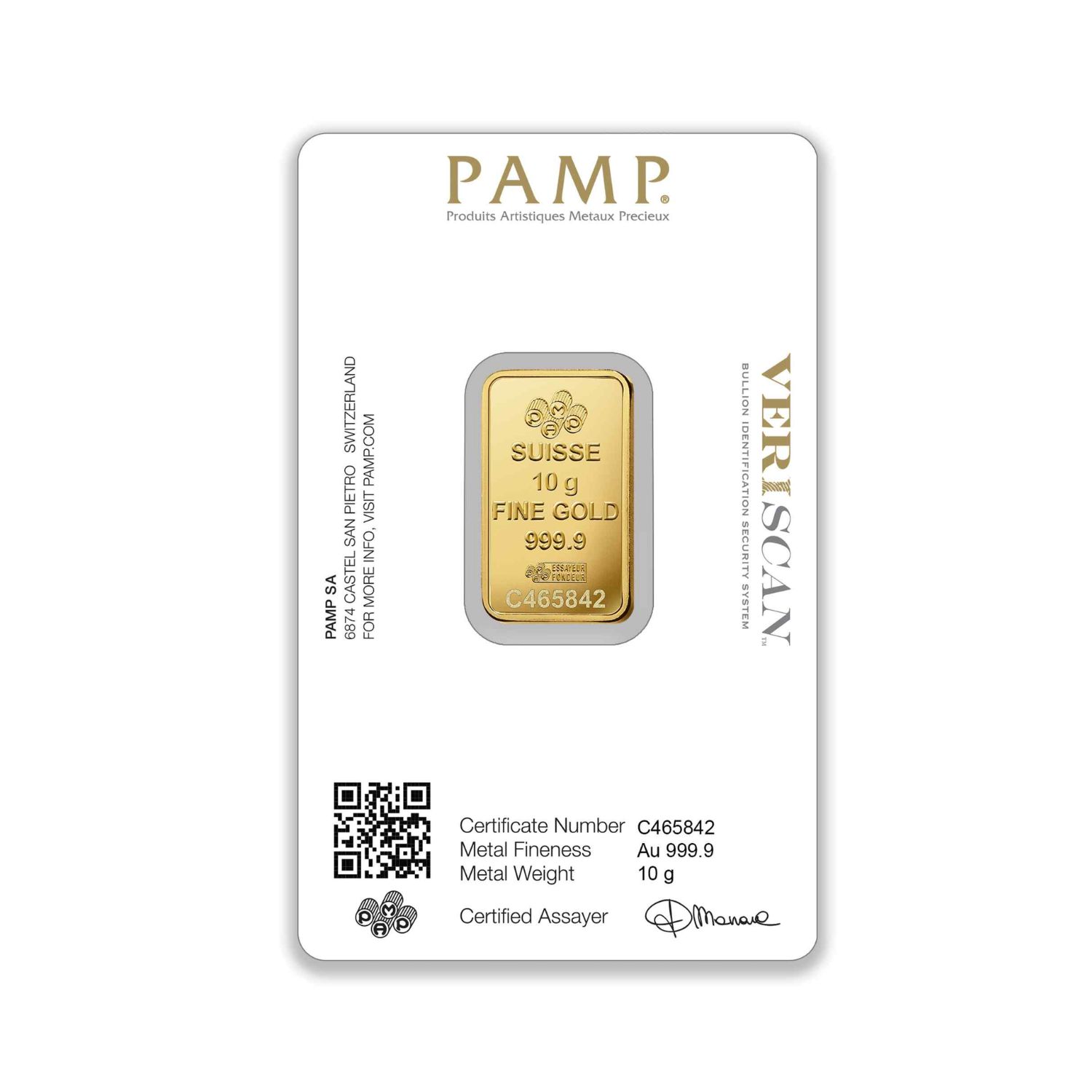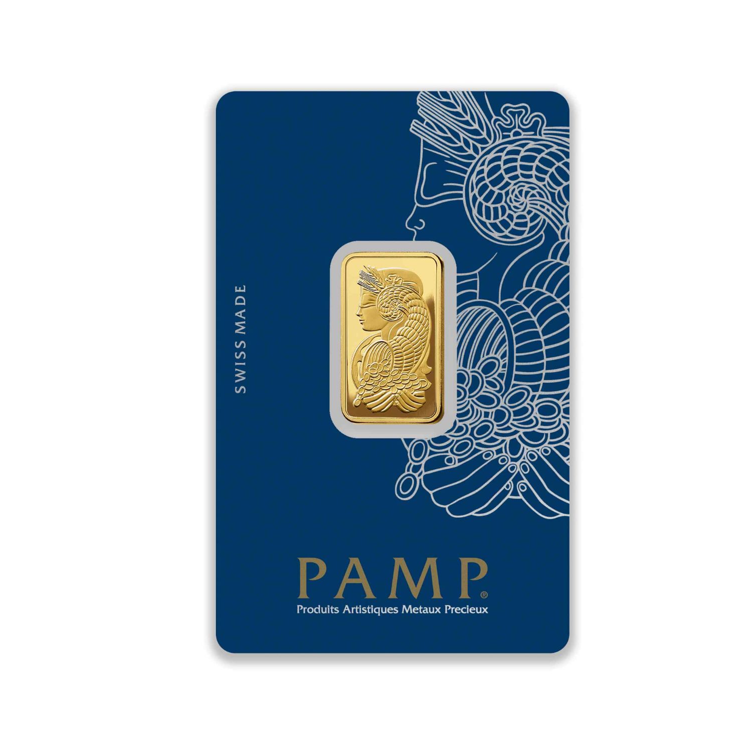 The back of the bar features the PAMP logo, the weight and purity of the bar, and a unique serial number. Each bar is individually packaged in a tamper-proof blister pack and comes with a certificate of authenticity.